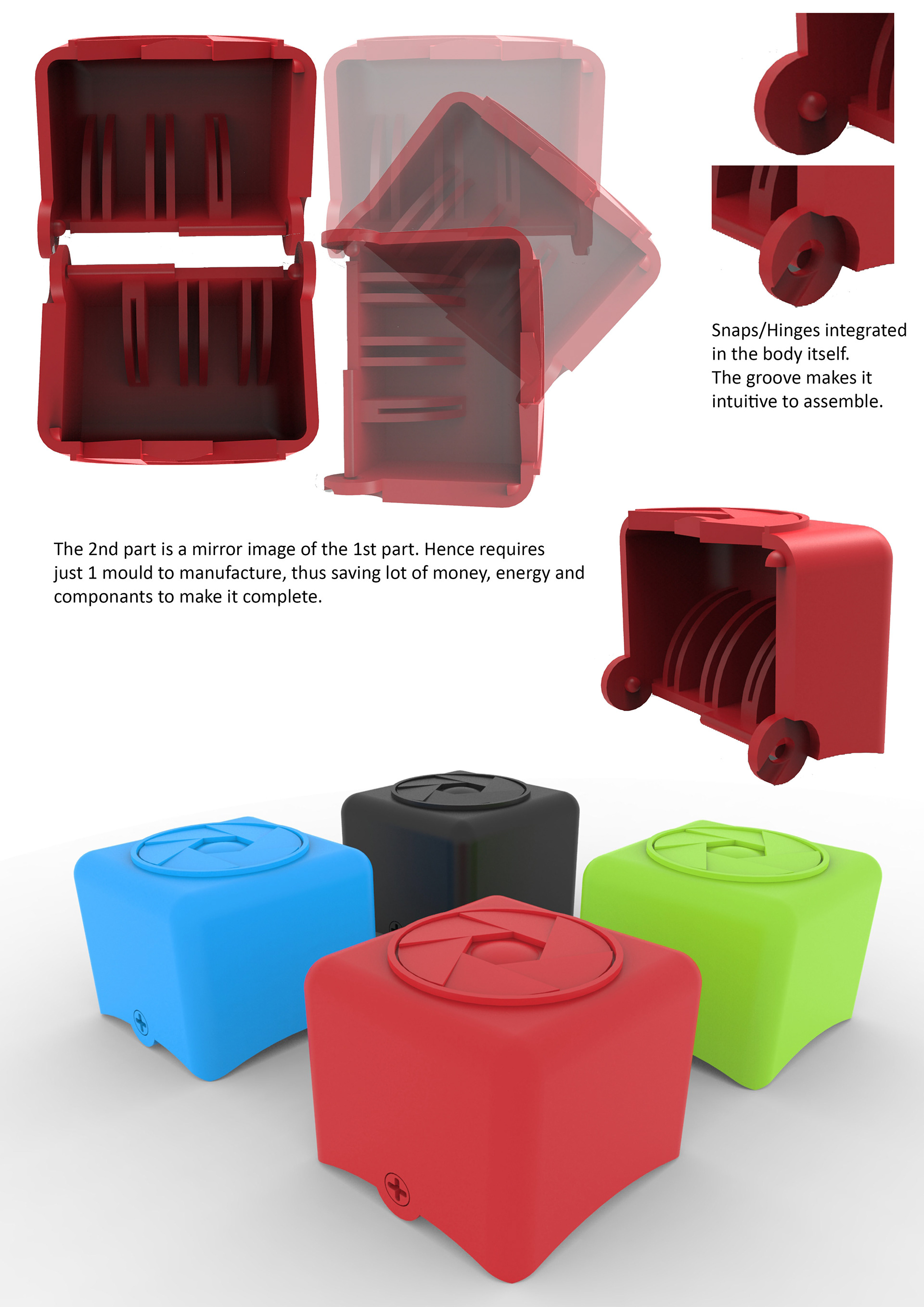 Usually a product consisting of two parts requires two different moulds to manufacture the parts, but in this concept,the 2nd part is the mirror image of the first part; hence requiring only 1 mould thus saving energy and money.